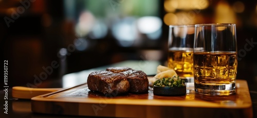 Steak and whiskey pairing, gourmet meal presentation, succulent grilled steak served with whiskey, garnished with green onions and lemon, elegant dining experience, copy space for text