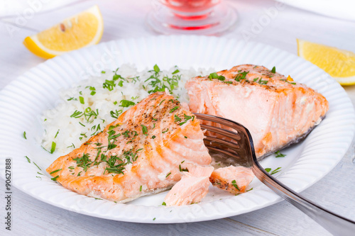 Steamed salmon with fresh herbs and lemon. Rice as a garnish