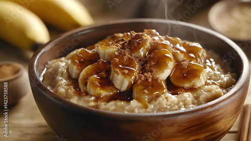 steaming bowl of oatmeal topped with caramelized banana and cinnamon creates warm, inviting breakfast scene