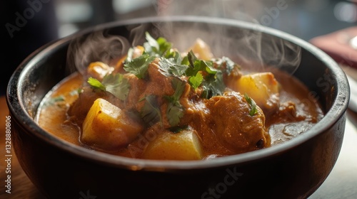 Steaming Bowl of Spicy Chicken Curry with Potatoes and Fresh Cilantro Garnish