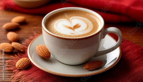 Steaming cappuccino decorated with latte art sits in a white ceramic cup on a saucer with almonds, placed on a rustic wooden table with a red cloth