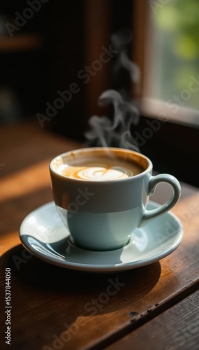 Steaming coffee, rich wood table texture, copy space, image, copy space, delicious