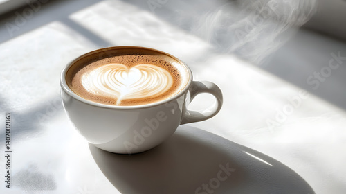 steaming cup of cappuccino with latte art in white cup sits on sunlit table