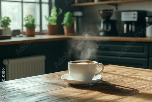 Steaming Cup of Coffee on a Wooden Table in a Cozy Kitchen with Natural Light and Indoor Plants, Inviting Warmth of Morning Routine and Comforting Vibes
