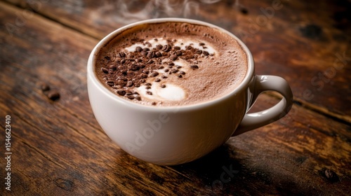 Steaming cup of hot chocolate with chocolate shavings on a rustic wooden table.