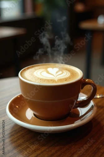 Steaming hot latte with frothy milk on a wooden table, coffee, beverage, milk