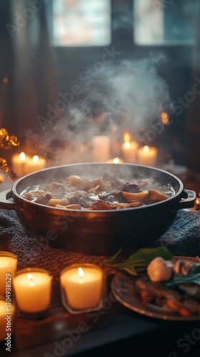 Steaming Mushroom Stew In A Dark Pot With Candles