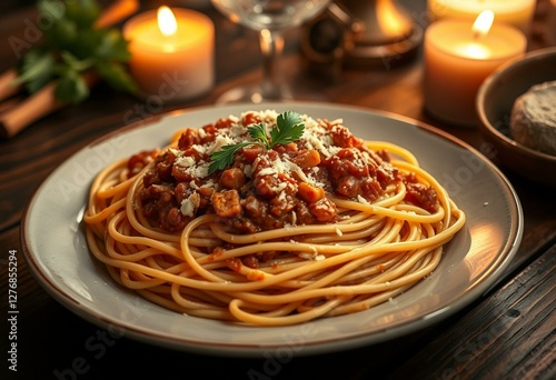 Steaming plate of spaghetti Bolognese with parmesan cheese and parsley on a rustic wooden table