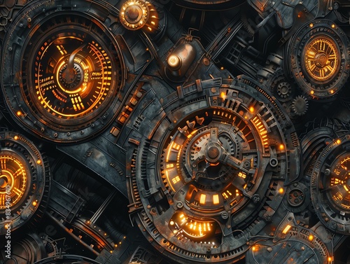 Steampunk design, worm's-eye view, brass gears, warm illumination, complex details, hyper detailed