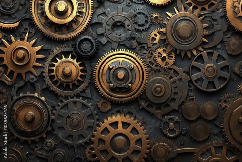 Steampunkinspired seamless wallpaper with gears and cogs, metallic textures, intricate details, bronze and gold tones