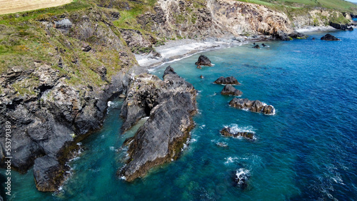 Steep cliffs on the coast of Ireland. Turquoise waters of the Atlantic Ocean. Natural beauties of Ireland, West Cork. The rocky coast of the Celtic Sea. Aerial photo.