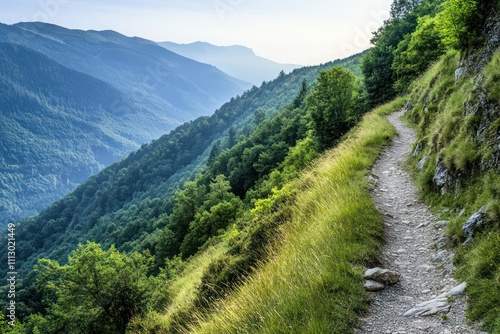 Steep mountain path lined with green forests, following the contours of a rugged hillside under a clear sky.