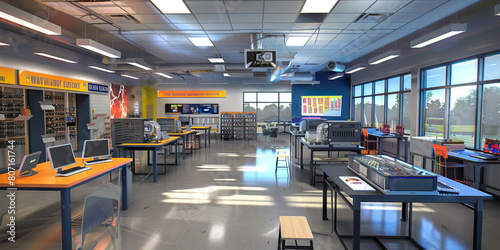 STEM Lab Floor: Featuring robotics kits, 3D printers, science experiment stations, and technology for hands-on STEM activities