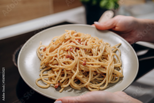 Step by step the process of cooking Italian pasta carbonara in spaghetti, add sauce with fried cubes of pancetta or bacon, eggs, cheese and garnish with basil