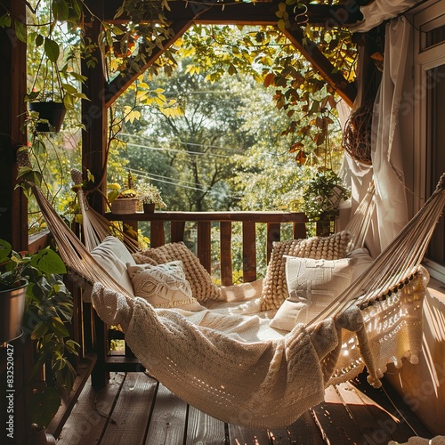 Step into a charming balcony sanctuary with a hammock swing suspended from the ceiling, surrounded by blooming plants and trailing vines. Experience the gentle sway of the hammock