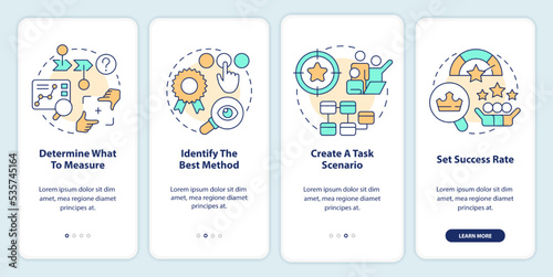 Steps to conduct site usability testing onboarding mobile app screen. Walkthrough 4 steps editable graphic instructions with linear concepts. UI, UX, GUI template. Myriad Pro-Bold, Regular fonts used