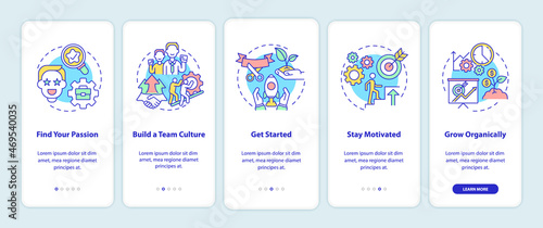 Steps to start social entrepreneurship onboarding mobile app page screen. Walkthrough 5 steps graphic instructions with concepts. UI, UX, GUI vector template with linear color illustrations