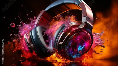 Stereo headphones exploding in festive colorful splash, dust and smoke with vibrant light effects