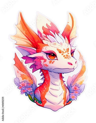 STICKER, illustration of vivid cute dragon, fantasy flowers splash, vintage watercolor design,