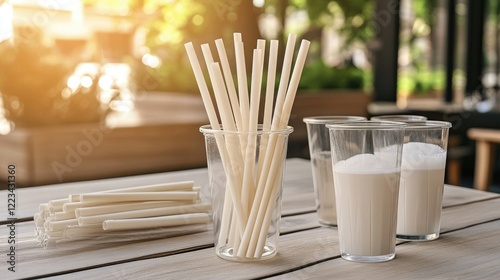 Sticks and glasses filled with beverages arranged on a wooden table in a sunlit outdoor space during a warm afternoon