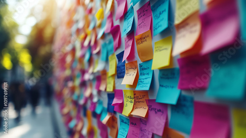 Sticky Note Post It Board Office. Business people meeting at office and use post it notes to share idea. Brainstorming concept. Sticky note on glass wall or blackboard. Set of colorful blank notes.