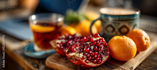 Still life featuring pomegranate, oranges, tea, and beverage on wooden surface, radiating warmth and freshness.