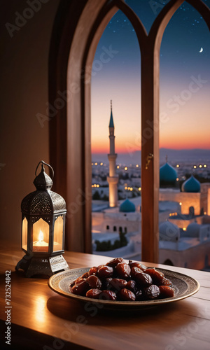 Still life with ornamental Arabic lantern and a plate of dates as a dish to start Iftar on a wooden table against window and a sunset sky with mosque and crescent moon on background. Ramadan Mubarak!