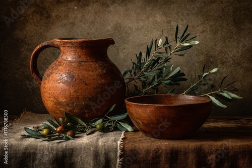 Still life with rustic earthenware jug bowl and olive branches on draped fabric.
