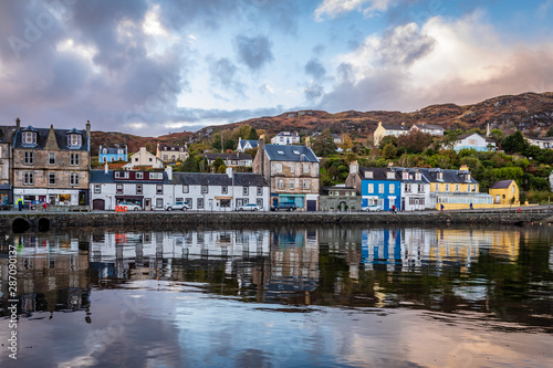 Still water of Tarbert Harbour reflect the beautifully painted houses on Barmore Rd in Argyll and Bute Scotland United Kingdom