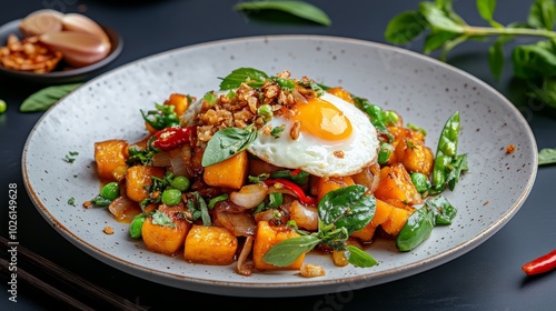 Stir-fried pumpkin with eggs showcasing soft stir-fried pumpkin with scrambled eggs in a light sauce garnished with fried garlic and served on a white ceramic plate
