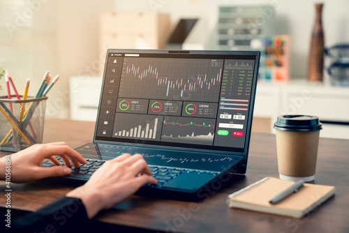 Stock exchange market concept, business people trader looking computer with graphs analysis candle line on table in office, diagrams on screen.