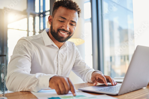 Stock market, accounting and fintech business man happy with company profit and statistics analysis data. Smile of a corporate accountant working on a laptop with financial software app and paperwork