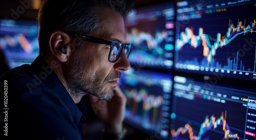 Stock market broker analyzing charts on multiple computer screens in office at night