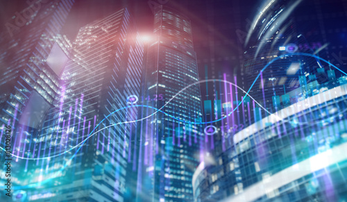 Stock market business concept. Financial graphs and digital indicators with modern city background