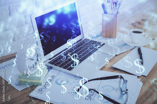 Stock market chart hologram drawn on personal computer background. Multi exposure. Concept of investment.