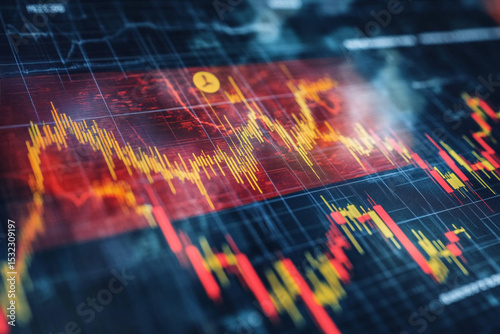 Stock market data displayed on a screen showing financial trends and graphs with red and yellow colors indicating price fluctuations