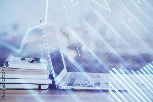 Stock market graph and table with computer background. Double exposure. Concept of financial analysis.