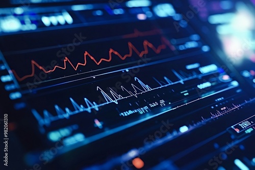 Stock market graph is being displayed on a monitor showing growing trends. The image evokes concepts such as finance, trading and investment