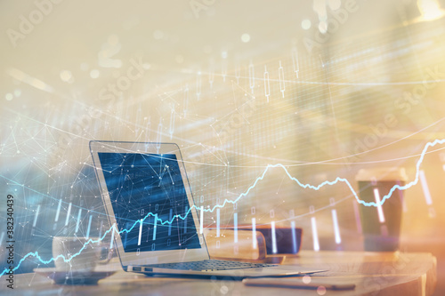 Stock market graph on background with desk and personal computer. Double exposure. Concept of financial analysis.