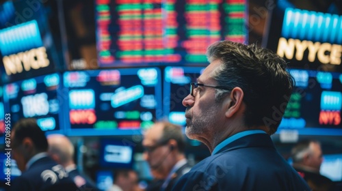 Stock traders working on a busy trading floor with digital screens displaying market data and stock prices.