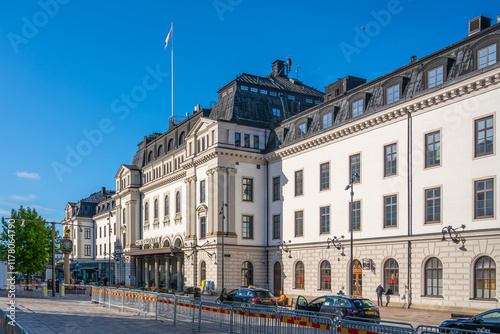 Stockholm Central Station showcases its impressive architecture under a bright blue sky. People can be seen walking around, while taxis wait along the curbside.