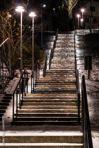 Stockholm, Sweden A public staircase in the snow at night in the Trekanten park in the Liljjeholmen district.
