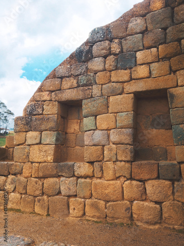 Stone and adobe wall of a temple of the sun of the Inca Cañari Ruins of Ingapirca. Cañar, Ecuador.