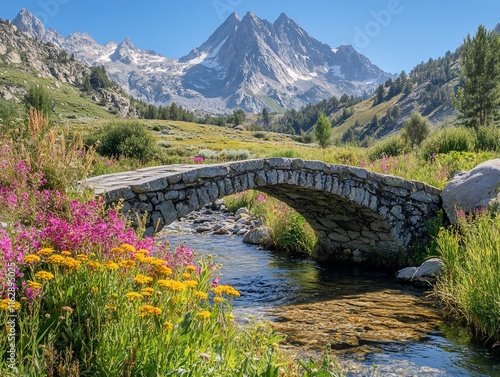 Stone bridge over a stream in a mountain valley with wildflowers.