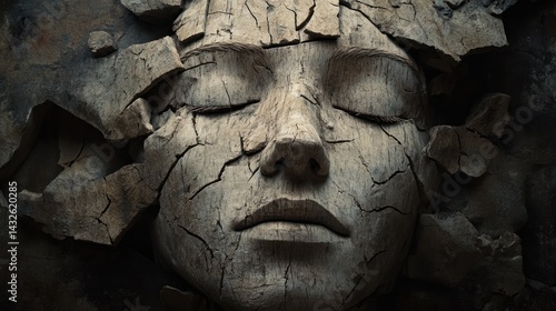 Stone face cracks, statue crumbles, art background, concept for aging, decay
