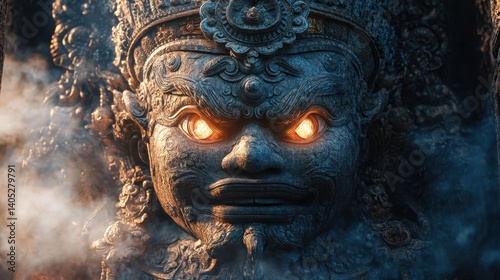 Stone guardian statue with glowing eyes amidst swirling smoke in an ancient temple at dusk
