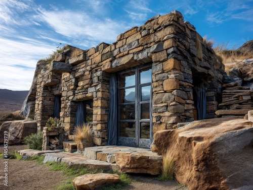 Stone House: A rustic retreat with natural materials and design, blending seamlessly into the rocky landscape under a partly cloudy sky.