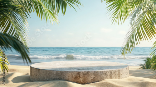 stone podium is displayed on sandy beach surrounded by lush green palm leaves, with serene ocean and clear blue sky in background, evoking summer vibe.