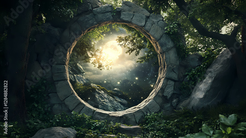 Stone portal nestled in lush greenery reveals a celestial scene. Celestial Forest Portal. Illustration