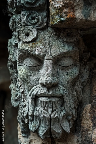 Stone sculpture of a bearded face with closed eyes adorns a building.